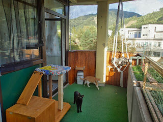 Your English is excellent and your furbabies are beautiful - as is the balcony and garden you have for them.